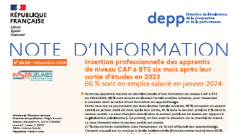 Ce chapitre porte sur l’évaluation des compétences au sortir de l’école ou du collège, ainsi que sur la réussite aux diplômes de l’enseignement secondaire et supérieur. Il traite de la situation des sortants du système éducatif et de leurs perspectives d’insertion professionnelle. Cette édition fait le point sur l'évaluation des compétences en maitrise de la langue en fin d'école, sur les compétences langagières et la littératie en fin de collège et sur celles en lecture sur support numérique.